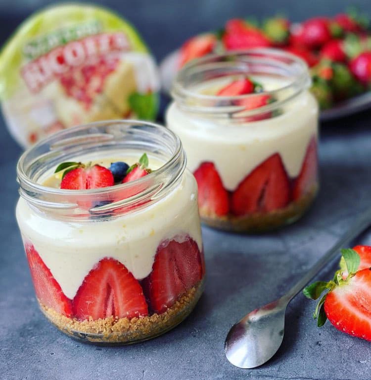 A kekszeket aprítsuk, vagy daráljuk le (használhatunk darált kekszet is), az olvasztott margarinnal keverjük össze. Nyomkodjuk a pohár/tál aljába. A pudingot főzzük meg a tejjel, édesítővel, hagyjuk kihűlni. Ha kihűlt, robotgép segítségével keverjük csomómentesre a ricottát a pudinggal. A kekszre rétegezzük az epreket tetszőlegesen, vagy a pohár szélére vagy az aljára, és erre mehet a krémünk. Pár órát pihentessük hűtőben, majd kanalazhatjuk is befelé.