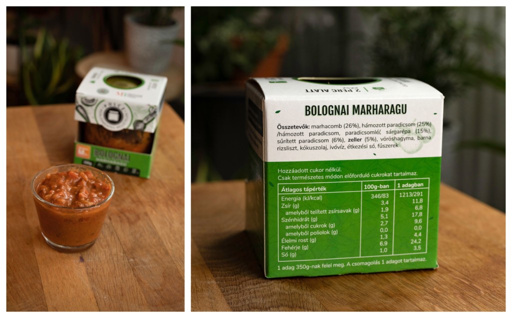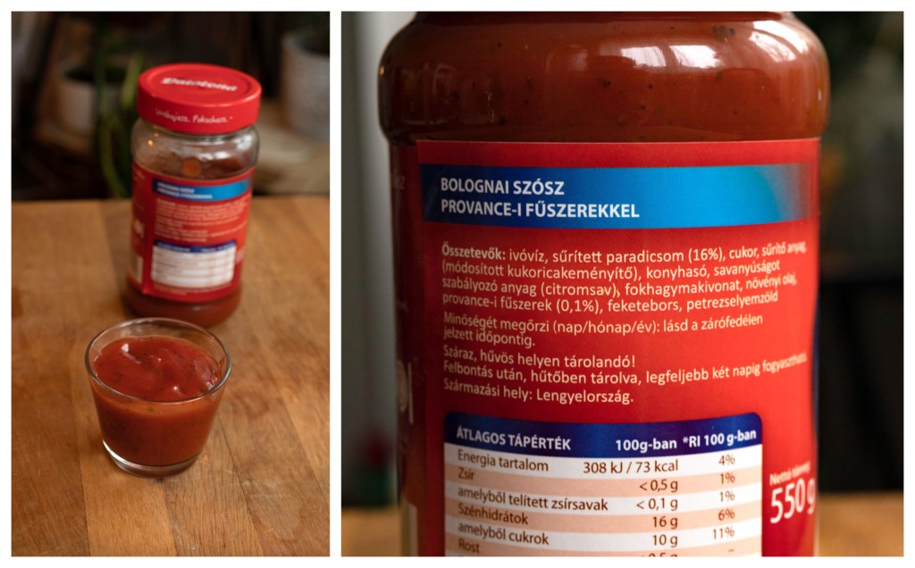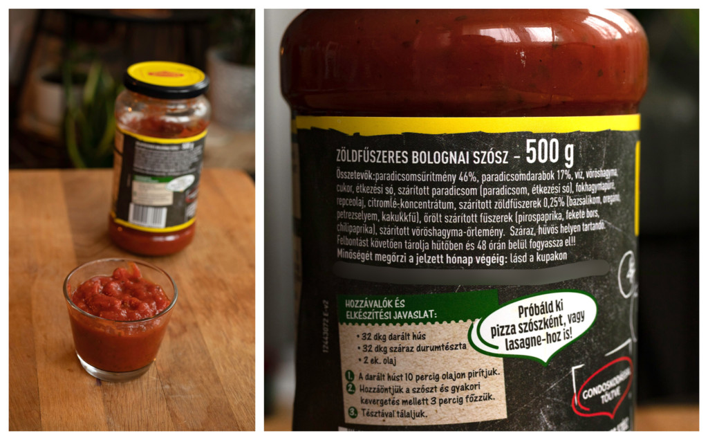 Kibontás után megcsapott minket a kellemes bolognai illat, állagra is jónak tűnt, bár egy picit hígnak ítéltük. Zöldségeket, húst is fölfedeztünk a szószban, ami a pürés és folyós szószok után egy igen üdítő látvány volt.