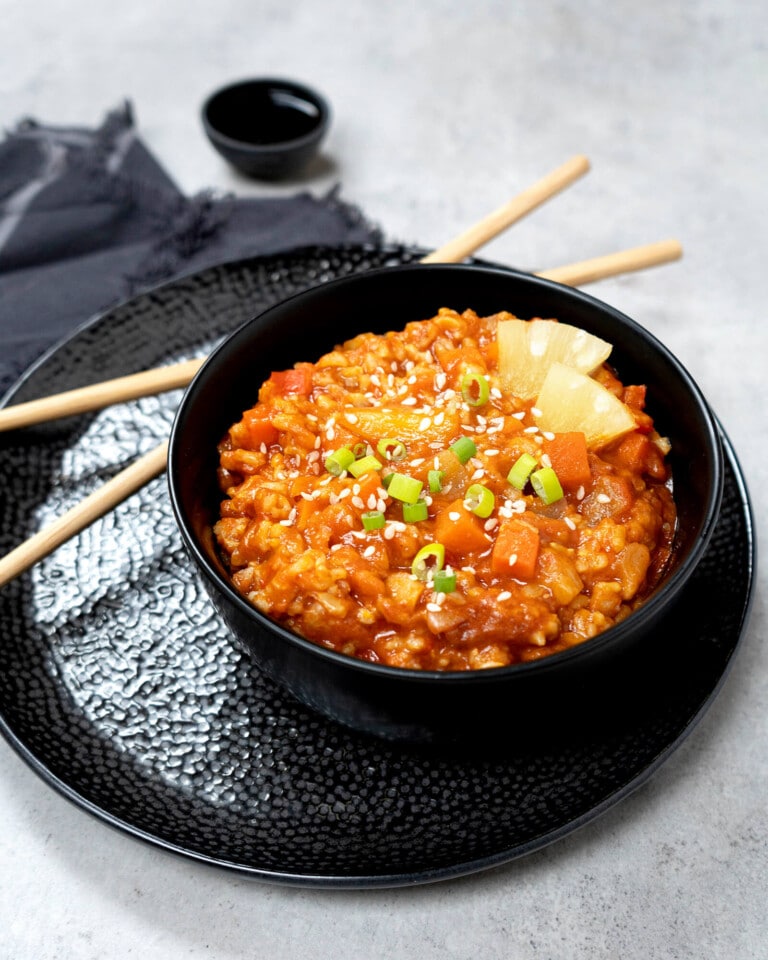 Ellenállhatatlan fúzió édeskés és savanykás ízekkel: fokhagymás-gyömbéres szósz, zöldségek és ananász egy komplett rizses vegán fogásban.
