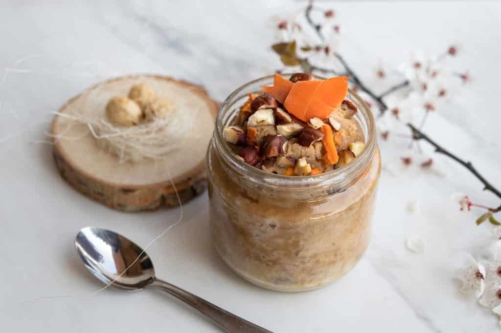 az üvegbe töltjük a hozzávalókat, majd egy alapos keverés után mehet is a mikróba. 1,5-2 perc és kész is! A tetejét díszíthetitek még ,,répamadárkával” vagy magokkal és indulhat is a falatozás!