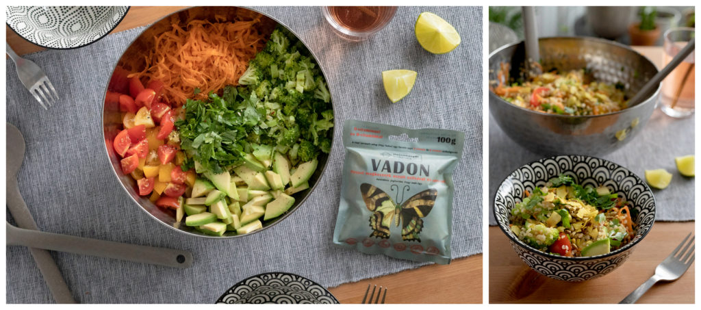 A quinoát 15 perc alatt megfőzzük sós vízben (kétszeres mennyisége a quinoának). Mindeközben a zöldségeket megmossuk és fölaprítjuk, majd, ha kihűlt egy picit a quinoa, szépen összedolgozzuk.