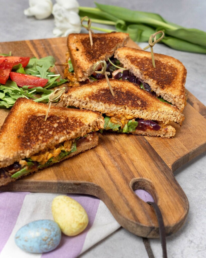 A kenyerek egyik felét vékonyan kend meg vajjal, a másik felükre jön majd a ,,töltelék”: kend meg a másik felét a csicseri krémmel, mehet rá egy kis rukkola, pár szelet paradicsom, egy kanál lilahagyma lekvár, majd a másik szelet kenyér és mehet is egy serpenyőbe, ahol pirítsd mindkét felét szép aranybarnára.