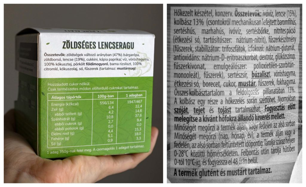 Érdemes a százalékos arányokat is összevetni, hiszen jól látható, hogy a ,,bolti” konzervekben az ételek fő alapanyagai összeadva sok esetben még az 50%-ot sem érik el. Emellett pedig a jelentős fölhasznált vízmennyiséget a leírásokban is olvasható sűrítőanyagokkal, így liszttel és kukoricakeményítővel kompenzálják. Végülis a főzeléknek valamitől össze kell állnia, ha már a víz van az első helyen a listában…