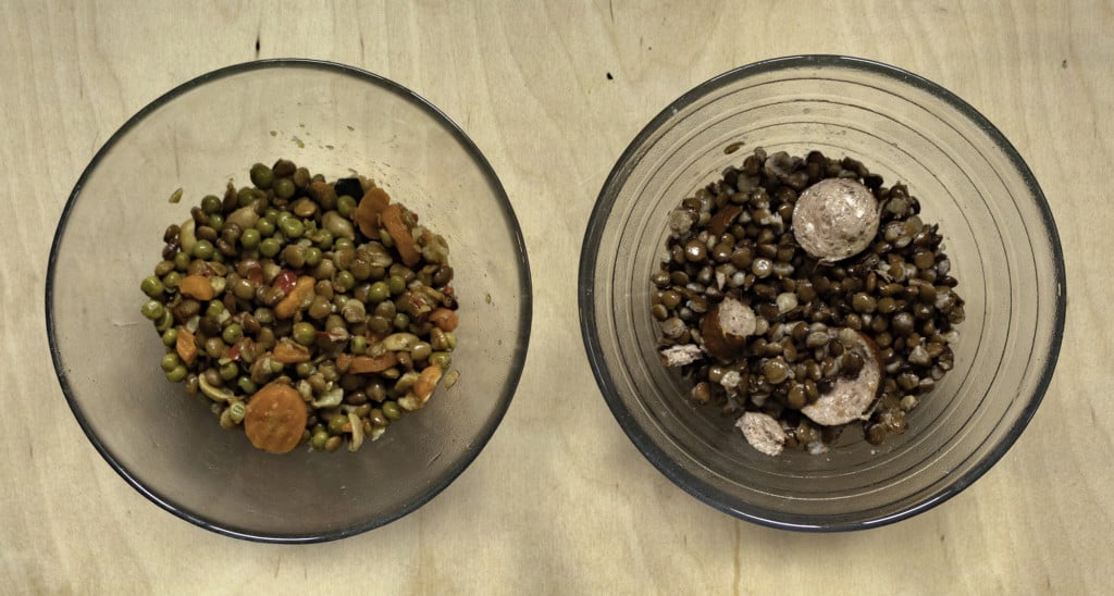 Végül pedig egy utolsó tesztnek vetettük alá a készételeket, vagyis megnéztük, melyikbe milyen alapanyagok kerültek ténylegesen. Maga a procedúra kicsit furcsa, hiszen gyakorlatilag lemostuk az ételről a szószt és a fűszereket, és megnéztük a visszamaradt alapanyagokat.