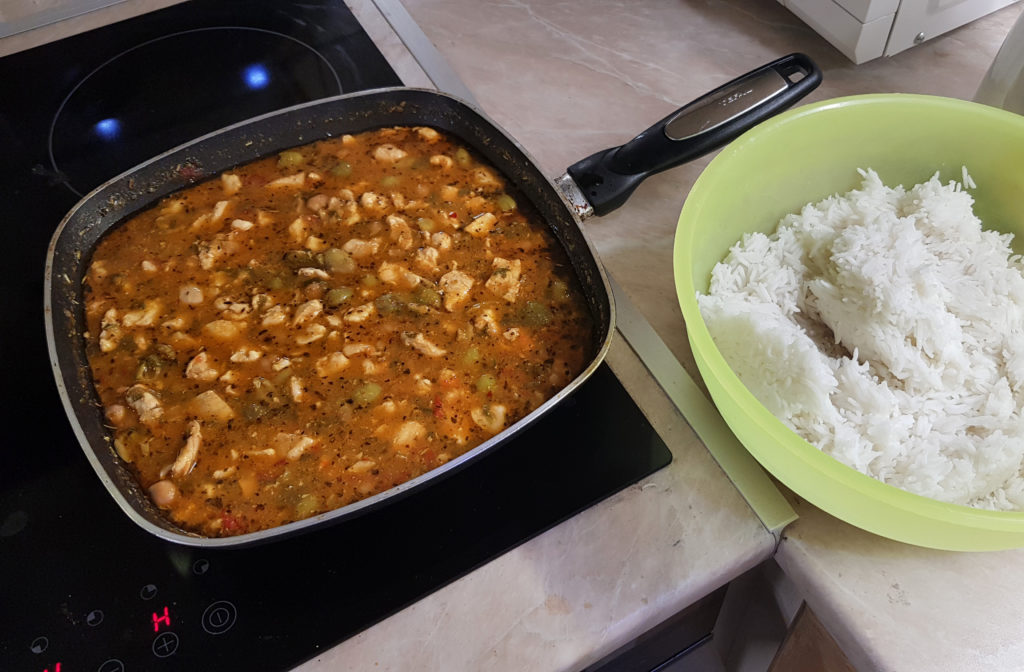 ,,Kb. 40 deka csirkét felkockáztam és olívaolajon megpirítottam, majd hozzáadtam egy egész adag Polcz Marokkói csicseriborsót és két maroknyi olívabogyót. Ezt követően nagyjából 10 perc alatt közepes lángon készre főztem, basmati rizzsel tálaltam.