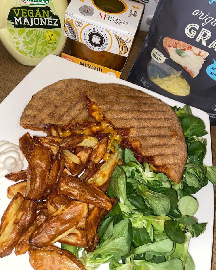 ,,Ti meguntátok már a melegszendvicset? Én nem hiszem! Ma a szafifree pitát POLCZ Mexikóival töltöttem, tettem bele Violife sajtot és lilahagymát. Isteni volt. Sütöttem mellé Tefal xxl-ben sültburit és Univer majonéz volt hozzá."
