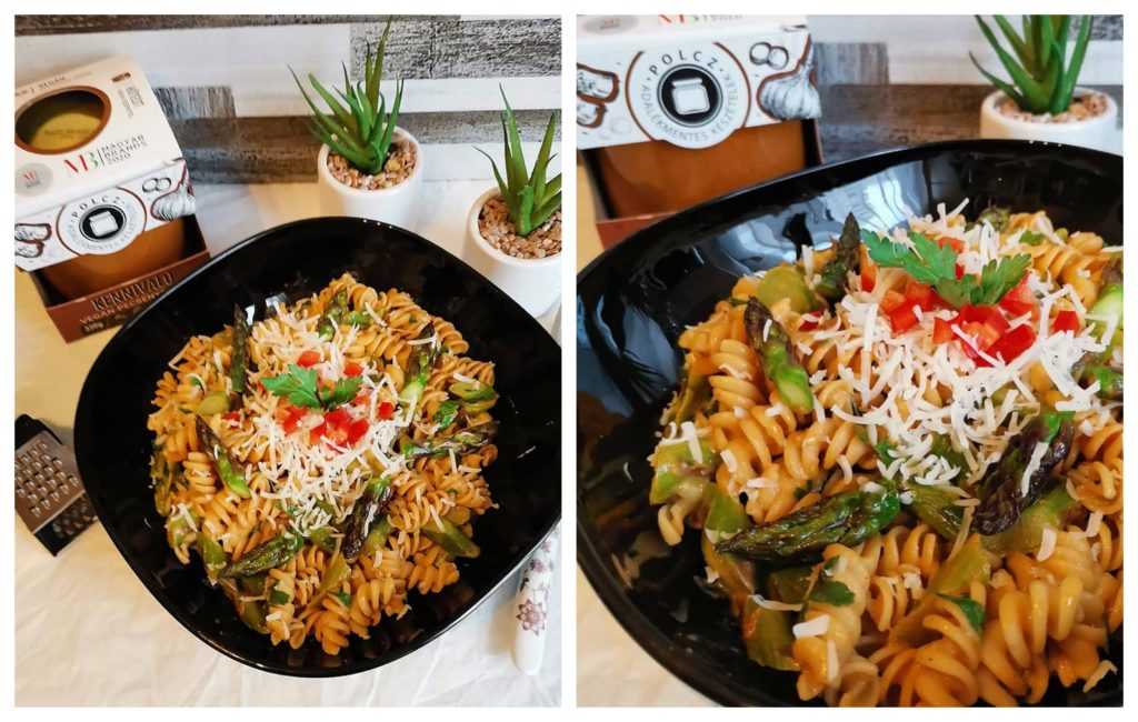 Szóval...volt még 1 adag POLCZ Csicseriborsós orsó tésztám. Amíg ez megfőtt a darabokra vágott zöld spárgát kevés bio vajon, pici sóval megpároltam. Miután puha lett, adtam hozzá 2 ek. Pecsenye krémet és annyi házi kesu italt, hogy mártás sűrűségű legyen. Simára kevertem, pár percig forraltam, a végén még beletettem egy adag friss, aprított petrezselyem zöldet is. Ezután hozzáadtam a kifőtt tésztát, alaposan összekevertem, majd tálaláskor Violife növényi reszelt "sajt" került rá. Isteni finom, laktató ebéd volt"