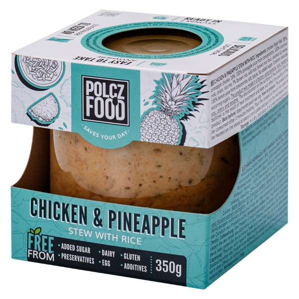 Összetevők: csirkecombfilé 36%, ananász kocka 18%, 100%-os ananászlé sűrítményből, 100%-os kókusztej, vöröshagyma, rizskeverék 7% (barna rizs, vadrizs), barna rizsliszt, kókuszolaj, ivóvíz, 100%-os citromlé sűrítményből, étkezési só, fűszerek