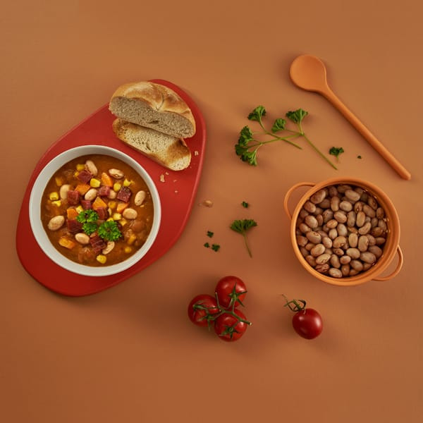 Összetevők: zöldségek változó arányban 30% (tarkabab 40%, kukorica 34%, sárgarépa), ivóvíz, hámozott paradicsom 12% (hámozott paradicsom, paradicsomlé), darált füstölt tarja 10% (sertéshús, étkezési só, természetes füst), vöröshagyma, barna rizsliszt, sűrített paradicsom, kókuszolaj, fűszerek, ételecet, étkezési só