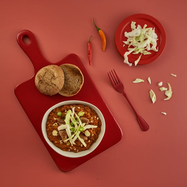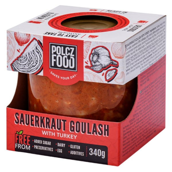 Összetevők: pulykacombfilé 32%, ivóvíz, vecsési savanyított káposzta 18% (fejes káposzta, étkezési só), vöröshagyma, paprika, barna rizs, sűrített paradicsom, kókuszolaj, barna rizsliszt, étkezési só, fűszerek, fokhagymapor, babérlevél