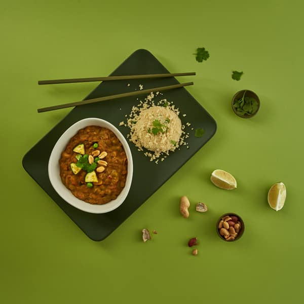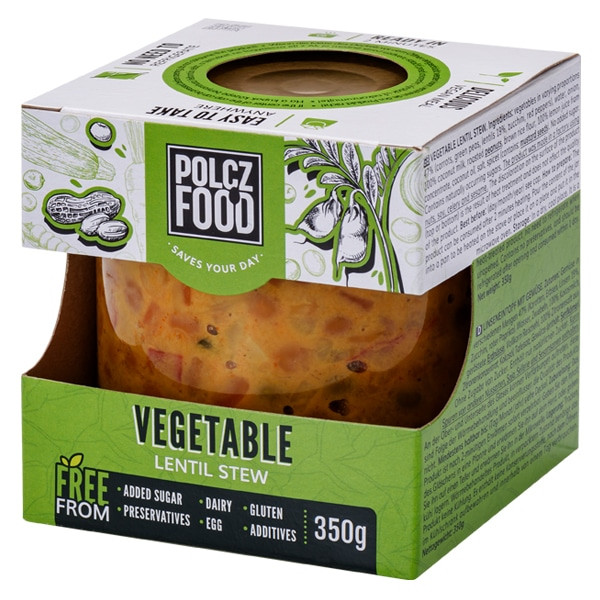 Összetevők: zöldségek változó arányban 47% (sárgarépa, zöldborsó, lencse 19%, cukkini, pritamin paprika), ivóvíz, vöröshagyma, 100%-os kókusztej, pörkölt