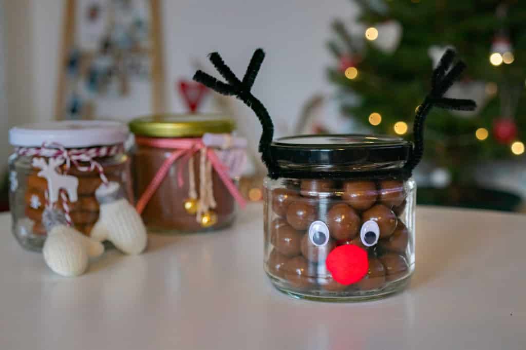 Az elkészítés nagyon egyszerű, hiszen a ragasztópisztoly segítségével felragasztjuk a szemeket és az orrot, majd agancsokat formálunk a zseniliából és az üveg szájára drótozzuk.